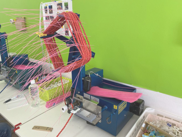 古いテグスが取れたロープに、30数センチほどの新しいテグスを機械を使って通していきます。